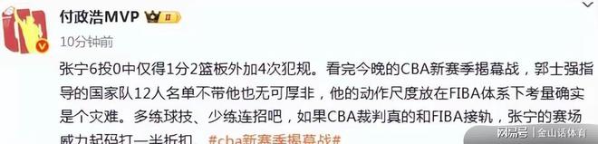 针对张宁在揭幕战的表现,著名媒体人付政浩发文点评:“张宁6投0中仅得1分2篮板外加4次犯规。看完今晚的CBA新赛季揭幕战,郭士强指导的国家队12人名单不带他也无可厚非,他的动作尺度放在FIBA体系下考量确实是个灾难。多练球技、少练连招吧,如果CBA裁判真的和FIBA接轨,张宁的赛场威力起码打一半折扣。”。