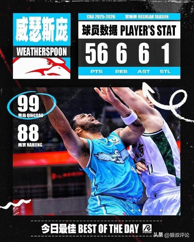 全场比赛,韦瑟斯庞出战24分钟,20中16,三分7中5得到56分6板6助攻1抢断1盖帽。